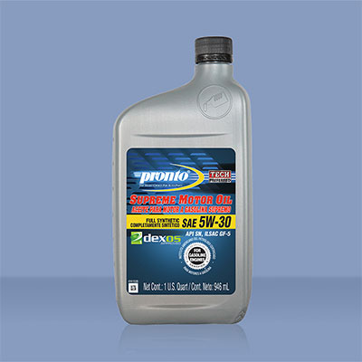 Detailed Description: Pronto 5W-30 full synthetic multi grade motor oil is formulated with a synthetic base oil which provide the highest level of engine protection while offering additional high temperature protection during even the most severe operating conditions. The 100% synthetic base oils that are used, provide exceptional resistance to high temperature oxidation thickening. The technologically advanced additives provide better protection against sludge and varnish formation, keeping your engine cleaner, longer. Pronto full synthetic motor oils provide excellent protection in challenging weather conditions and offers superior fuel economy.